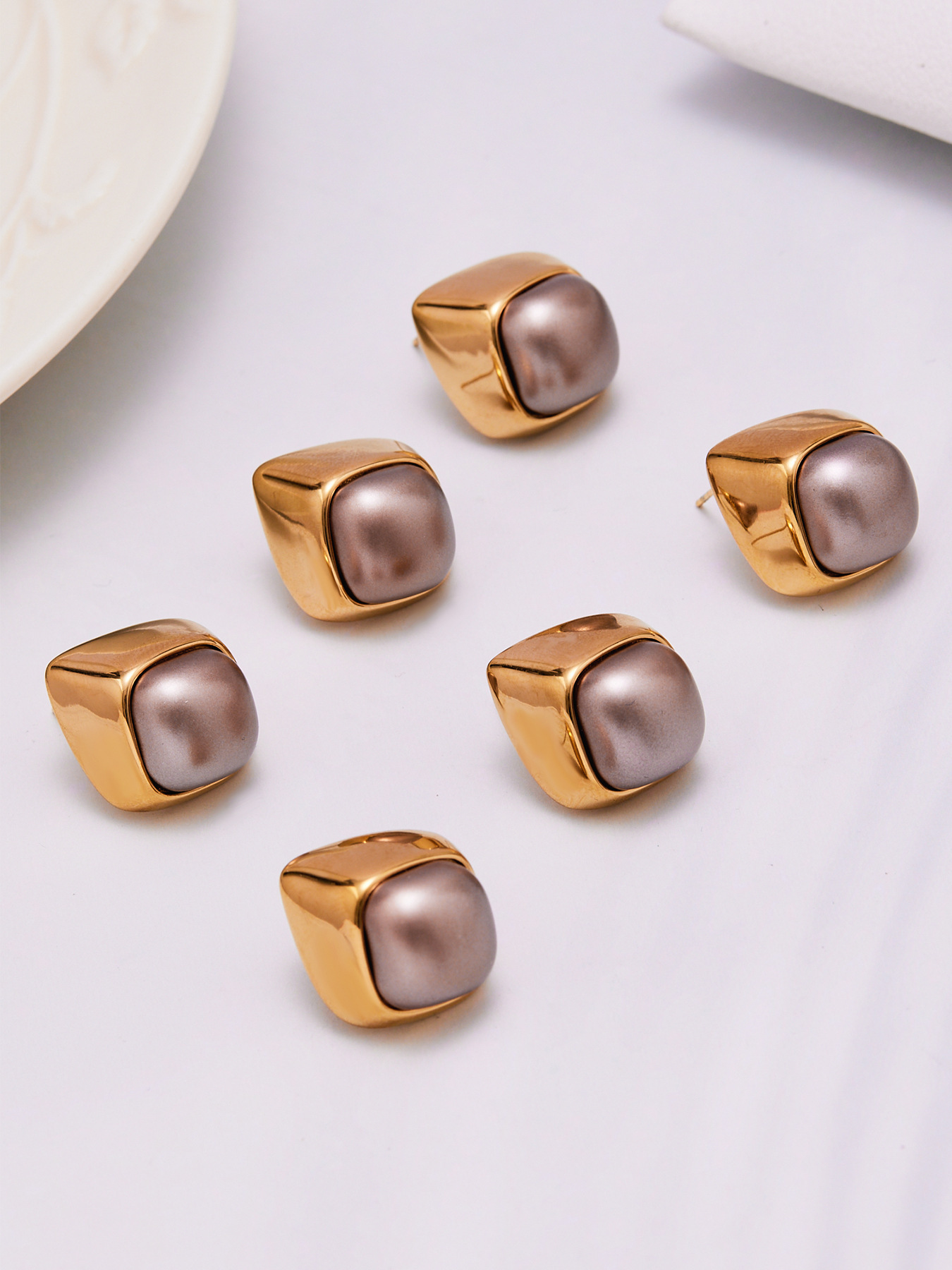 Profile:Stainless steel geometric irregular grey imitation pearl stud earrings, a unique design for the fashionably inclined, with 18k genuine gold plating.