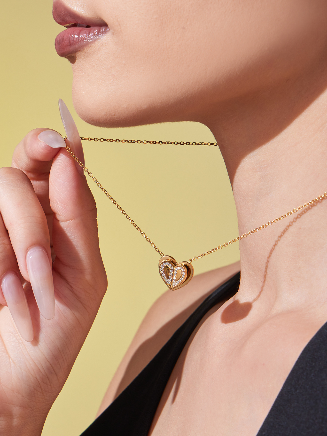 Profile:Design double-layer heart-shaped 5A zirconia ring, earrings and necklace. Made of stainless steel and plated with 18k gold.
