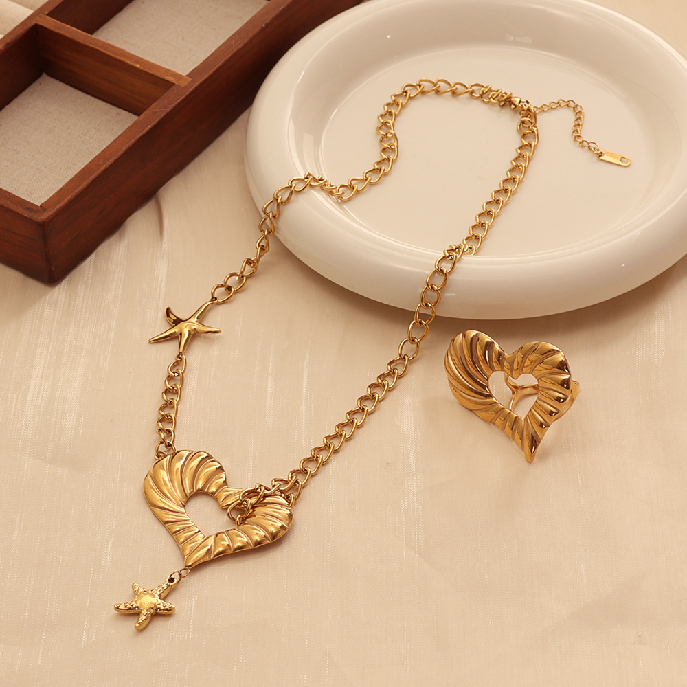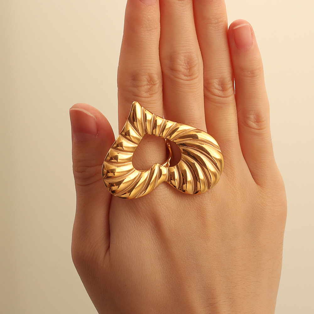 Profile:Fashion accessory hand jewelry - large heart-shaped hollowed-out ring with exaggerated European style, asymmetrical design, for exclusive female use, plated with gold.