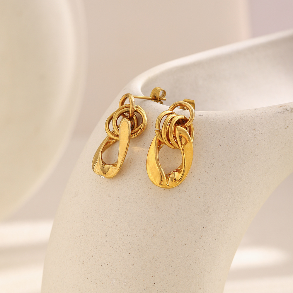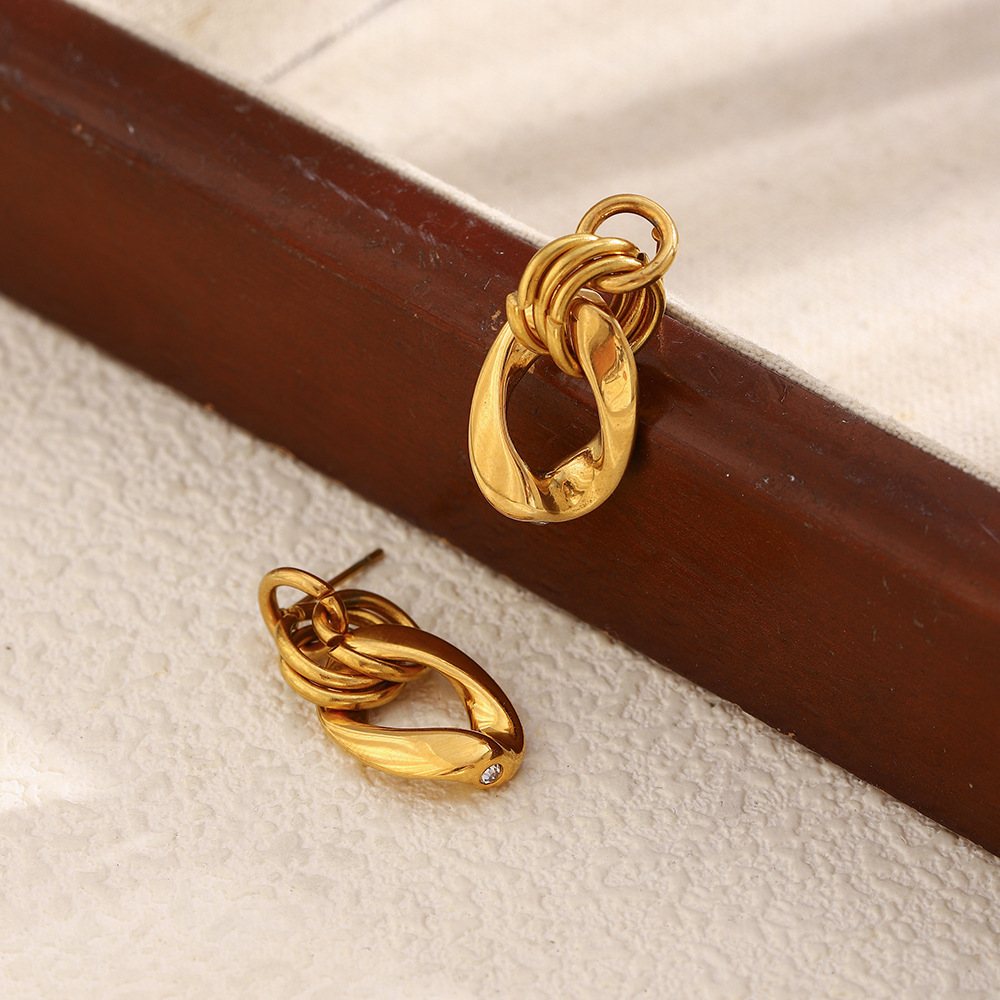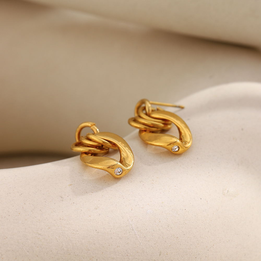 Fashionable and elegant design creative earrings. Stainless steel plated with 18K gold and set with diamonds. Simple ear studs.