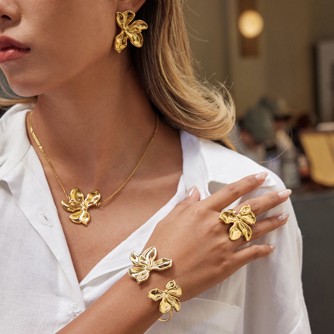 Profile:Stainless steel bracelet, titanium steel necklace, luxury and niche style ring, stainless steel ear ring, nine-layered wisteria flower accessory set