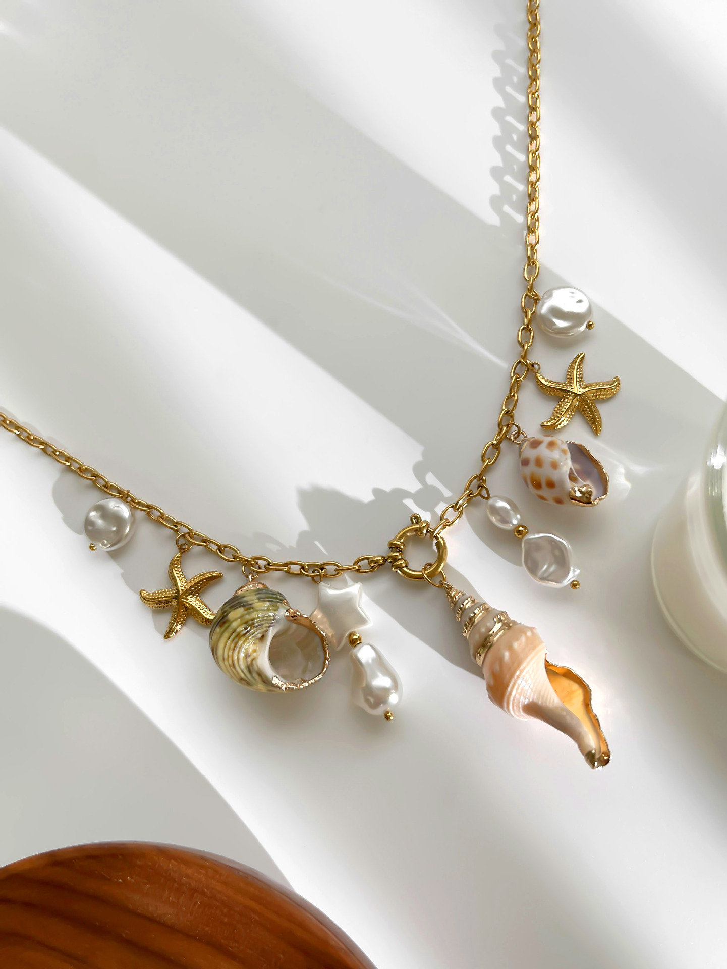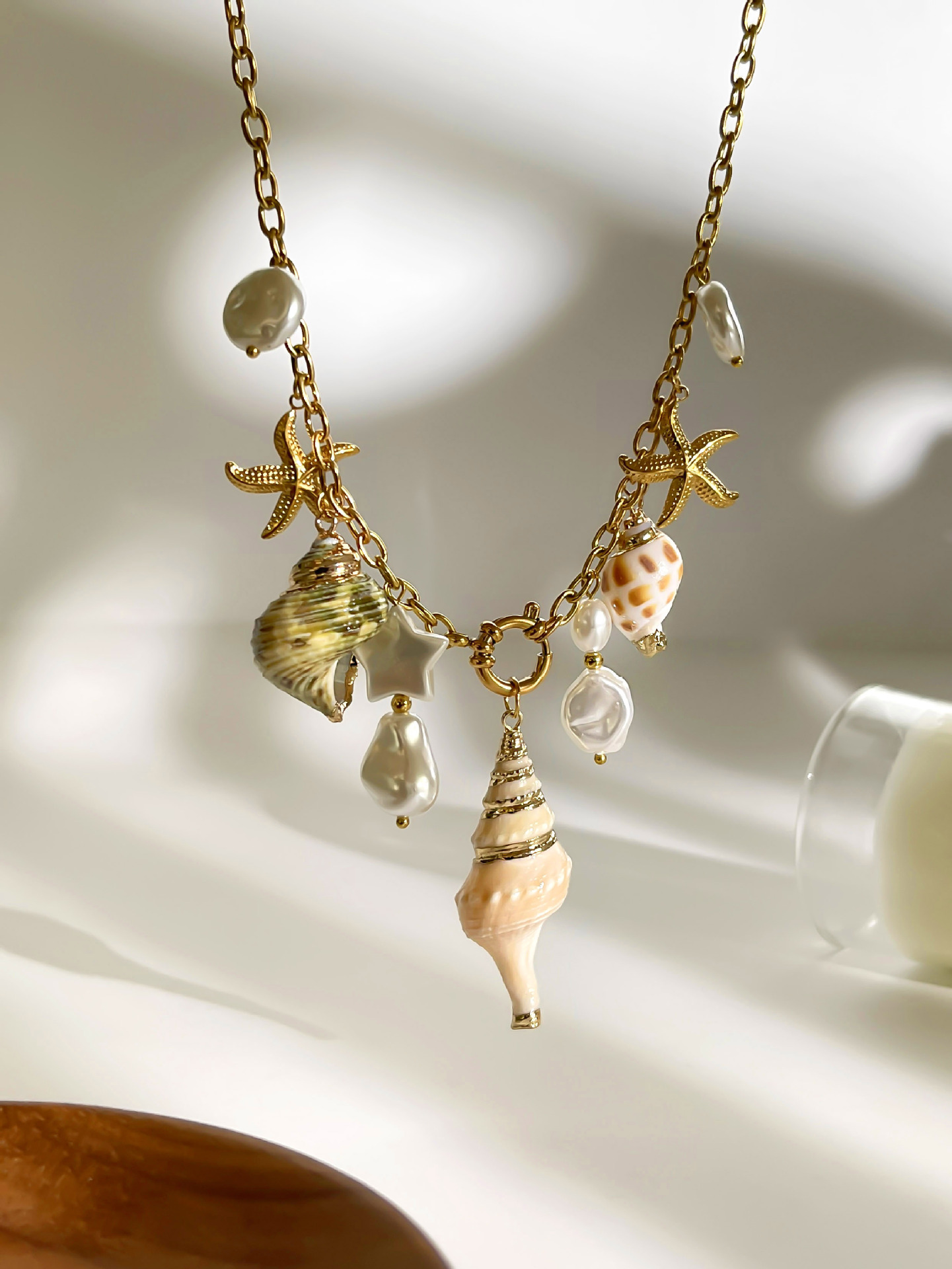 Profile:Stainless steel sea snail textured sea star pearl multi-bead lady's necklace - Design-inspired beach style necklace