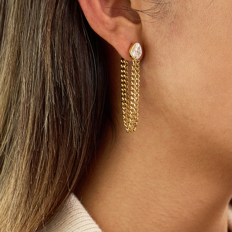 Profile:Chain dangling stainless steel zircon earrings - luxurious and high-end ear jewelry with a touch of sophistication. Suitable for autumn and winter. Made of stainless steel. European-style accessories.