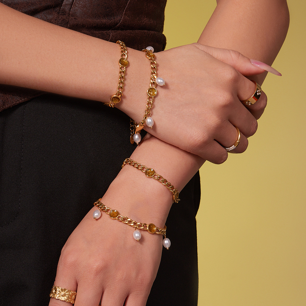 Profile:Best-selling imitation pearl fringed necklace and bracelet, stainless steel plated with 18k gold, indie design jewelry set