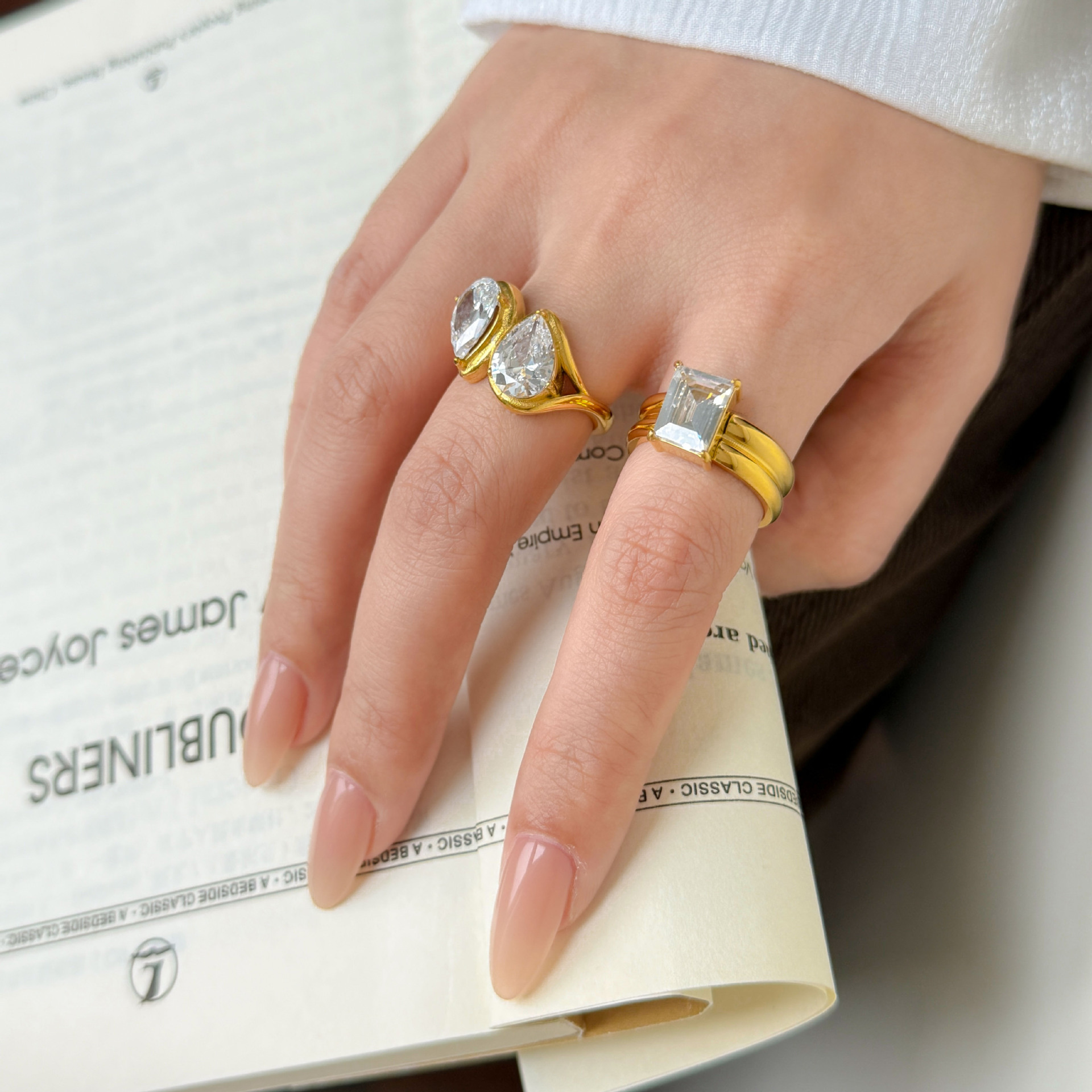 Large oval shape ring, square large rectangular zircon arc-shaped double layer, double droplet titanium steel plated with 18K gold
