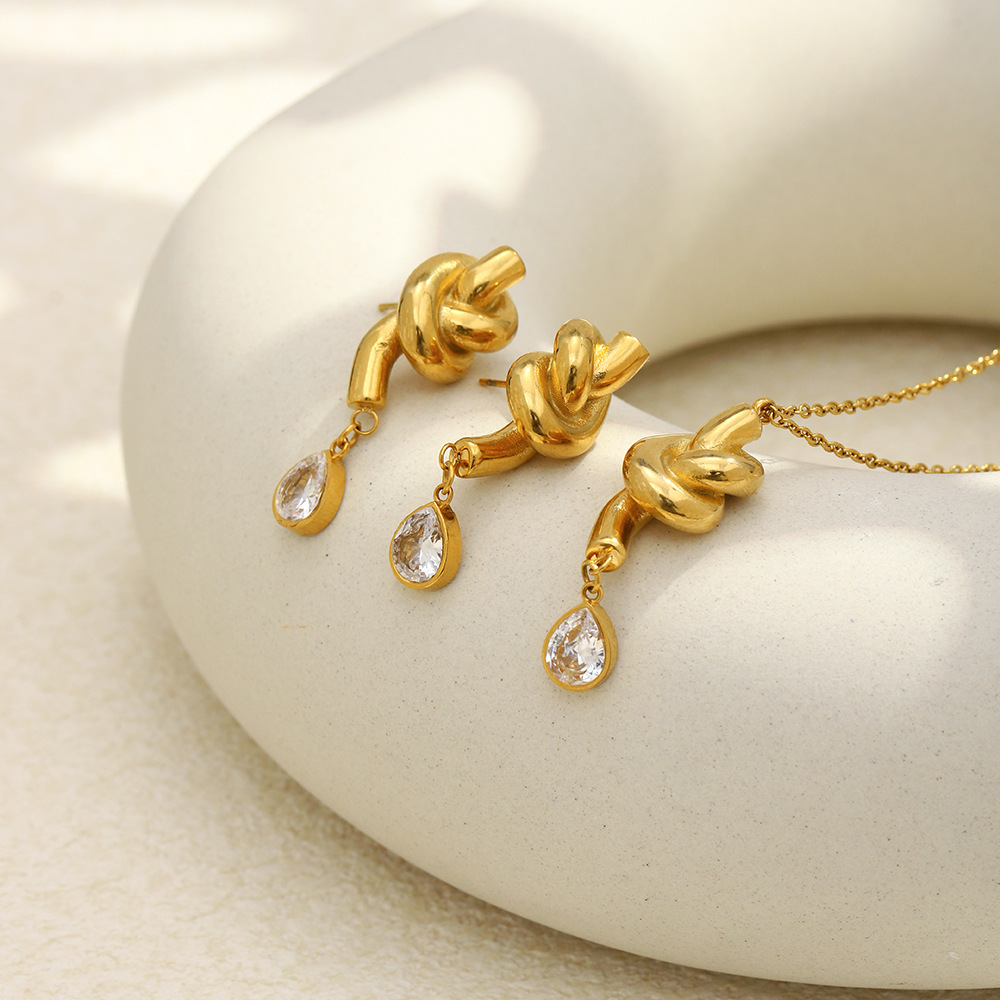 Retro luxury ear jewelry - stainless steel plated with 18K gold, knotted drop-shaped zirconia necklace accessory