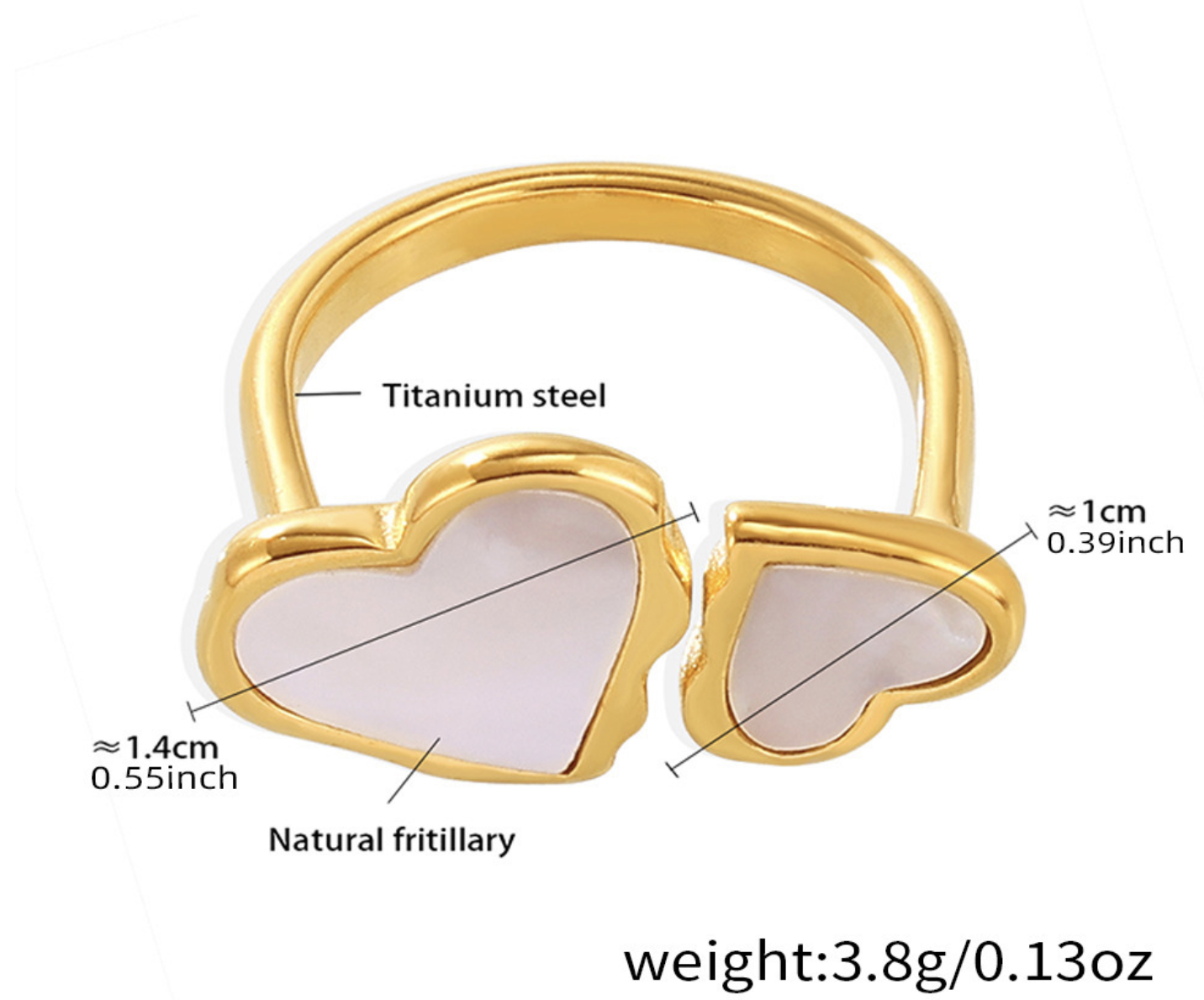 Profile:Geometric double heart-shaped open natural mother-of-pearl ring, stainless steel plated with 18k genuine gold, elegant hand jewelry accessory